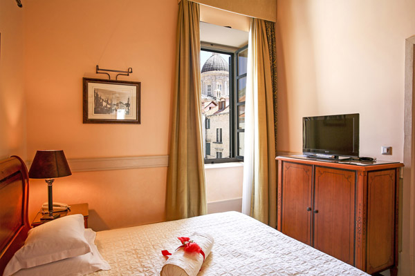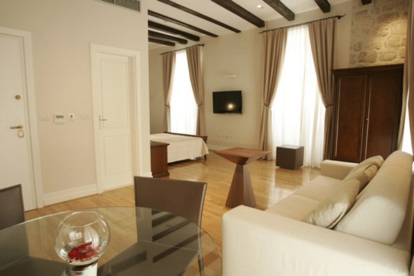 The Senior Suite located on the top floor has classical features and modern design. Our luxury suite accommodation in Dubrovnik is named after Junije Palmotić, a nobleman of the city and features a spacious living room on two levels and bedroom. The bathroom has a large Jacuzzi, it can be used as your Spa corner.